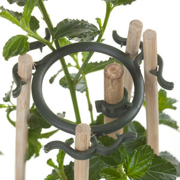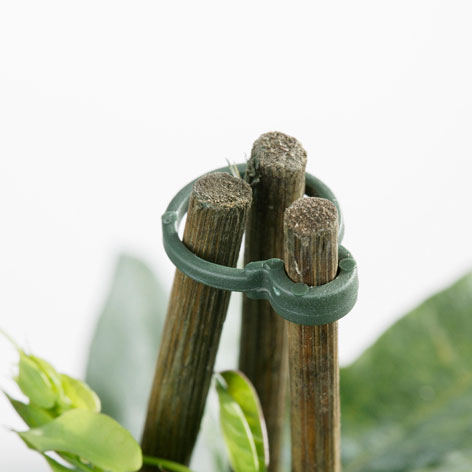La abrazadera de caña JOBU se usa para plantas que requieren varias cañas dispuestas en trípode para au apoyao y para mantener la distancia entre sí durante el cultivo.